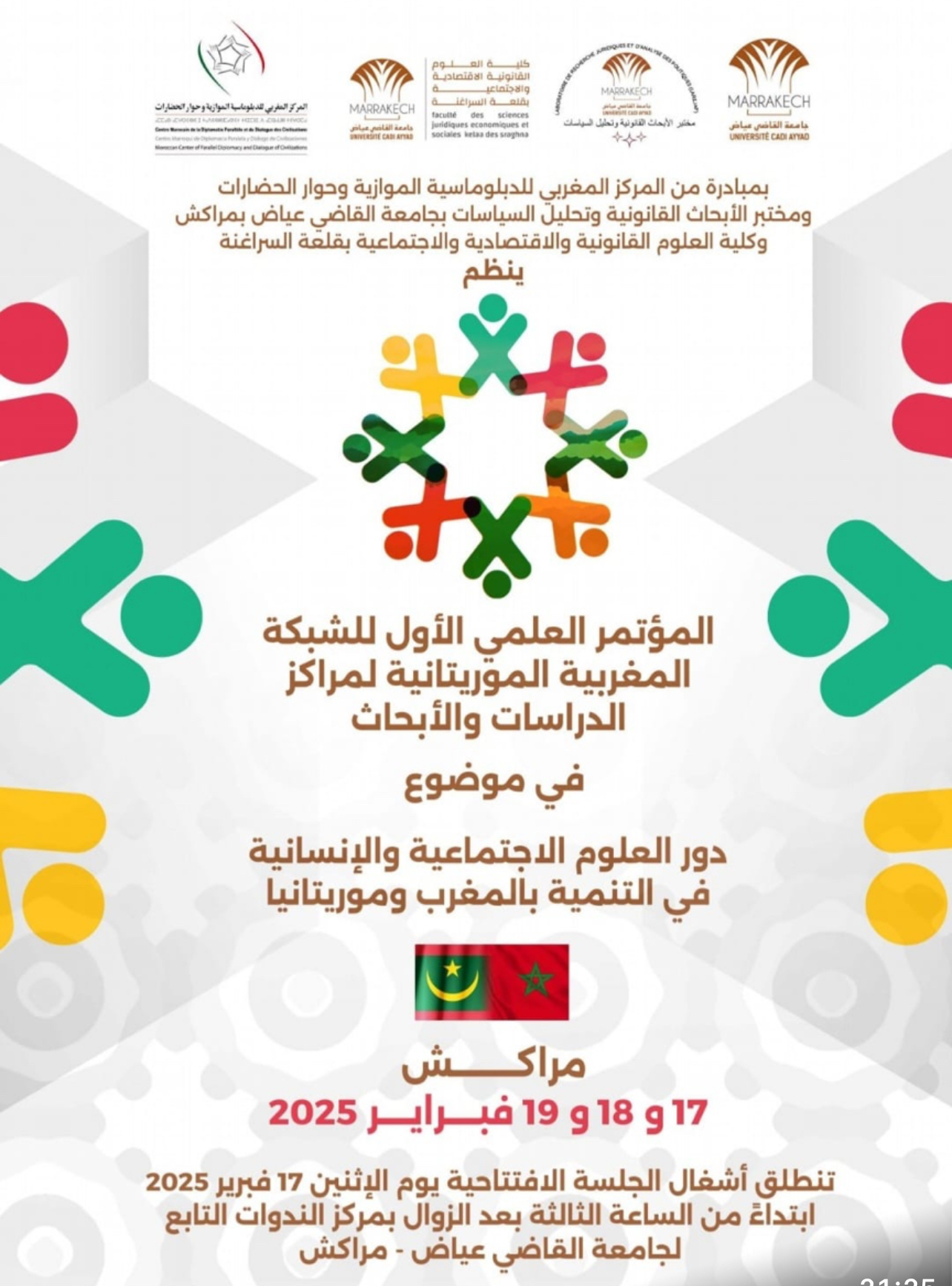 El Primer Congreso Científico de la Red de Centros de Estudios e Investigaciones Marroquí-Mauritana se celebrará en Marrakech, Reino de Marruecos, del 17 al 19 de febrero de 2025. Bajo el título “El papel de las ciencias sociales y humanas en el desarrollo sostenible en Marruecos y Mauritania”, el congreso tiene como objetivo fomentar el debate sobre la contribución de las ciencias sociales y humanas al desarrollo sostenible y a la formulación de políticas públicas en ambos países.